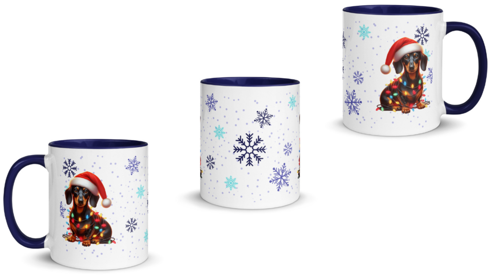 An 11oz mug with navy color on the inside and a cute design on the outside